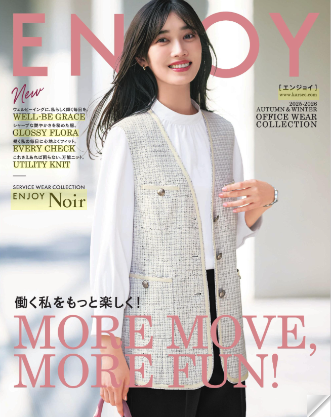 アクティブに働く女性たちをスタイリッシュにサポートするユニフォームが「エンジョイ」。オフィスの事務、受付、営業職。接客などのサービス。